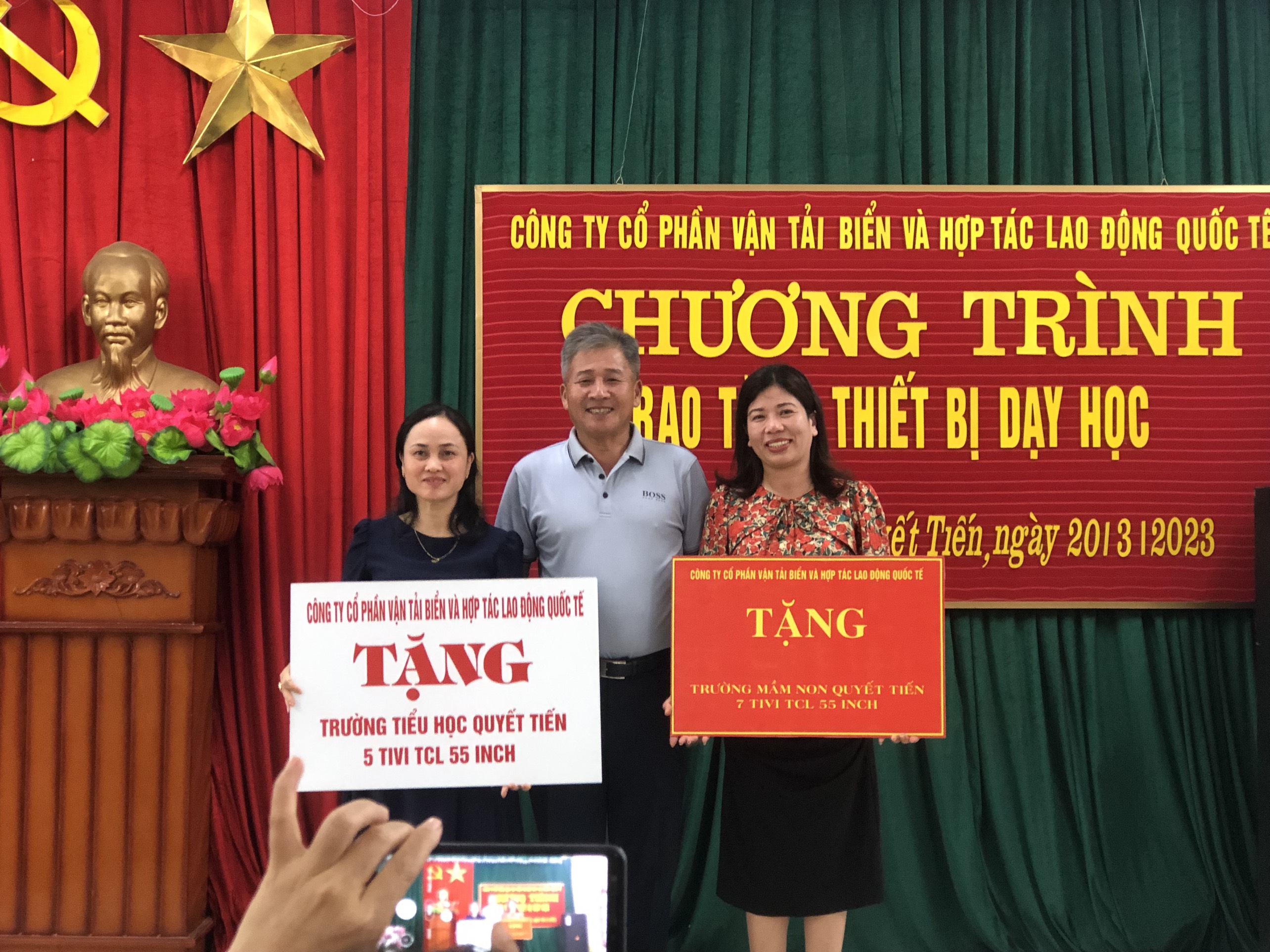 Và hôm nay, ngày 20/3/2023, các trường học trên địa bàn xã Quyết Tiến lại vinh dự đón nhận những tấm lòng vàng từ một tình cảm đặc biệt đối với các nhà trường – Đó là Công ty Cổ phần vận tải biển và Hợp tác lao động Quốc tế trao tặng cho các nhà trường trang thiết bị dạy học: Trường MN Quyết Tiến tiếp nhận 7 tivi TCL 55 Inch, Trường TH Quyết Tiến tiếp nhận 5 tivi TCL 55 Inch. Những món quà quý giá này không những giúp các em học sinh có đủ các phương tiện học tập, các em được học tập trong điều kiện tốt hơn mà còn giúp các thầy cô thực hiện tốt nhiệm vụ giáo dục của mình trong tình hình giáo dục hiện nay – thực hiện chuyển đổi số trong giáo dục.