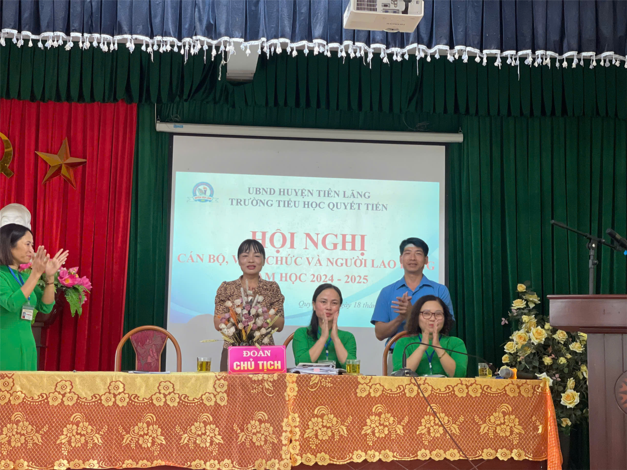 Đến dự Hội nghị có các vị đại biểu đại diện cho Liên đoàn lao động Huyện, các đồng chí trong ban cấp ủy Đảng và chính quyền xã Quyết Tiến; các ông bà đại diện cho Hội cha mẹ học sinh và toàn thể cán bộ, giáo viên, nhân viên của trường cũng có mặt đông đủ.